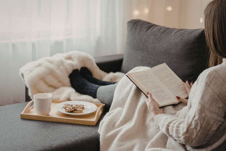 Une femme installée dans un coin lecture cosy sur un canapé gris, enveloppée d'un plaid, lisant un livre avec des cookies et une tasse.